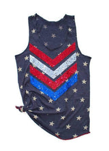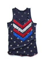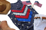Show off your love for the USA with our adorable red silver and blue sequin chevron design on a racerback star tank top. Perfect for 4th of July or whenever you're feeling patriotic!