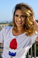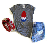 Women's slouchy style tee shirt or unisex crew neck tee shirt, this sequin design features a sequin Bomb Pop on the front. Perfect for 4th of July or whenever you're feeling patriotic!