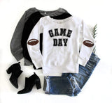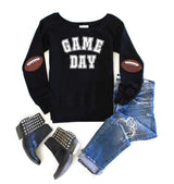 Women's wide neck and a unisex style for the football lover with sequined elbow patches on the sweatshirt and unique graphic lettering on the front.