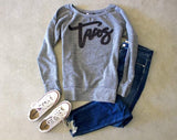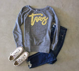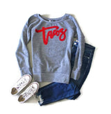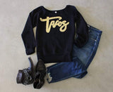 Women's wide neck or unisex style sweatshirt designed with the word 'Tacos' in script style lettering on the front. Perfect for Taco Tuesday, Cinco De Mayo or any day!