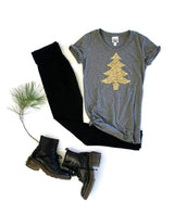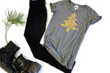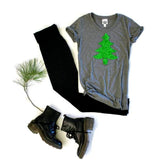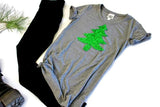 Unisex style tee shirt with a Christmas Tree patch on the tee shirt front.
