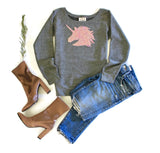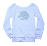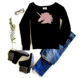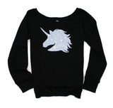 Women's wide neck and unisex, sequined sweatshirt featuring adorable sequin unicorn design.