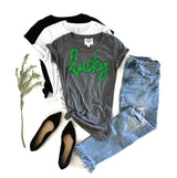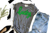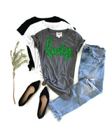 Unisex style tee shirt with a sequin 'Lucky' patch on the tee shirt front.
