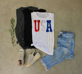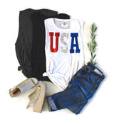 Women's tank top style to celebrate the USA with a sequin red silver and blue 'USA' patch on the tank front.