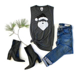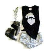 Women's tank top style to celebrate the holidays with Santa's sequined hat and beard patches on the shirt front.