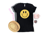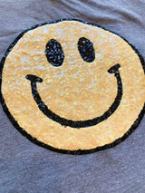 Let a little sparkle into your life with our handmade sequin smiley face design available on a tee shirt in your choice of color.