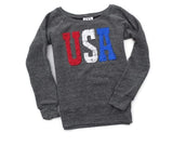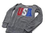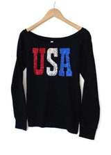 Women's wide neck and a unisex style for those moments you want to express your love of the good 'ol USA with sequined patches U S A letters on the front.